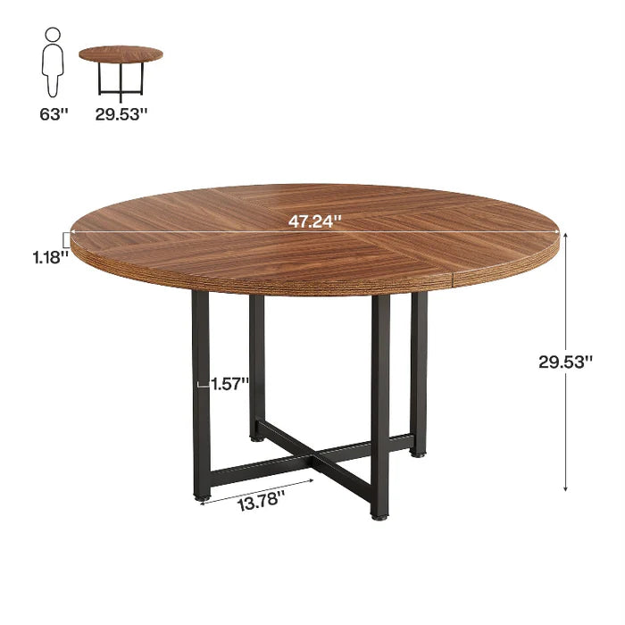 Stylish Farmhouse-Industrial: Enhance your dining space with this 47-inch round table that blends rustic charm and modern industrial aesthetics. The versatile two-tone black and brown finish effortlessly complements contemporary and traditional interiors. Space-Saving Yet Spacious: This 47-inch diameter table comfortably seats 4-6 people, offering ample room for dishes and décor. Its round shape maximises space in tight layouts and ensures child-safe edges. Heavy-Duty Stable Construction: Built with a premium MDF tabletop and a robust 250 lb weight capacity, the reinforced X-frame metal base provides wobble-free stability. Adjustable levelling feet accommodate uneven floors. Multi-Functional for Any Setting: Perfect for home dining rooms, kitchens, flats, or as a home office/craft table, this piece adapts effortlessly to various needs and settings.