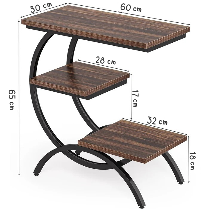 This table is defined by its elegant C-shaped black metal frame, offering three levels of vertical storage. The tiered shelves provide ample space for books, decor, or electronics while maintaining a light, airy footprint.