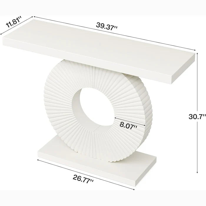 Functional & Stylish Console: This elegant white console table blends modern glamour with practical design through its distinctive frame and flowing curved accents. It creates a luxurious focal point, perfect for displaying décor. Versatile Accent Piece: Use this adaptable table to showcase collectibles, as a stylish study accent, or behind your sofa to organize essentials. Its chic design instantly elevates your home décor. Durable Engineered Wood Top: The substantial 1.57-inch thick tabletop supports up to 120 lbs. At 39.4 inches long, it offers ample display space. Artistic Geometric Base: The open-frame design showcases wave-inspired cutouts. Precision welding ensures durability, rust resistance, and wobble-free stability.