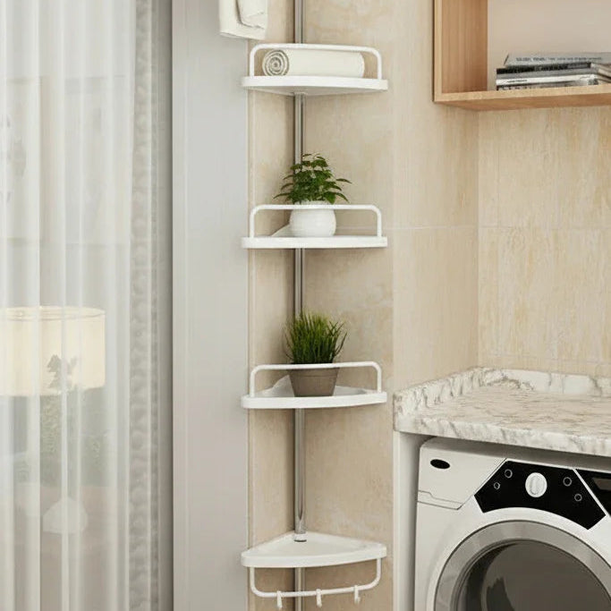 The rack features Height-Adjustable Telescopic Poles for a secure fit in any bathroom configuration. Its 4-Tier Spacious Storage provides generous, vertical space for bottles, sponges, and washcloths, maximizing underutilized corner space.
